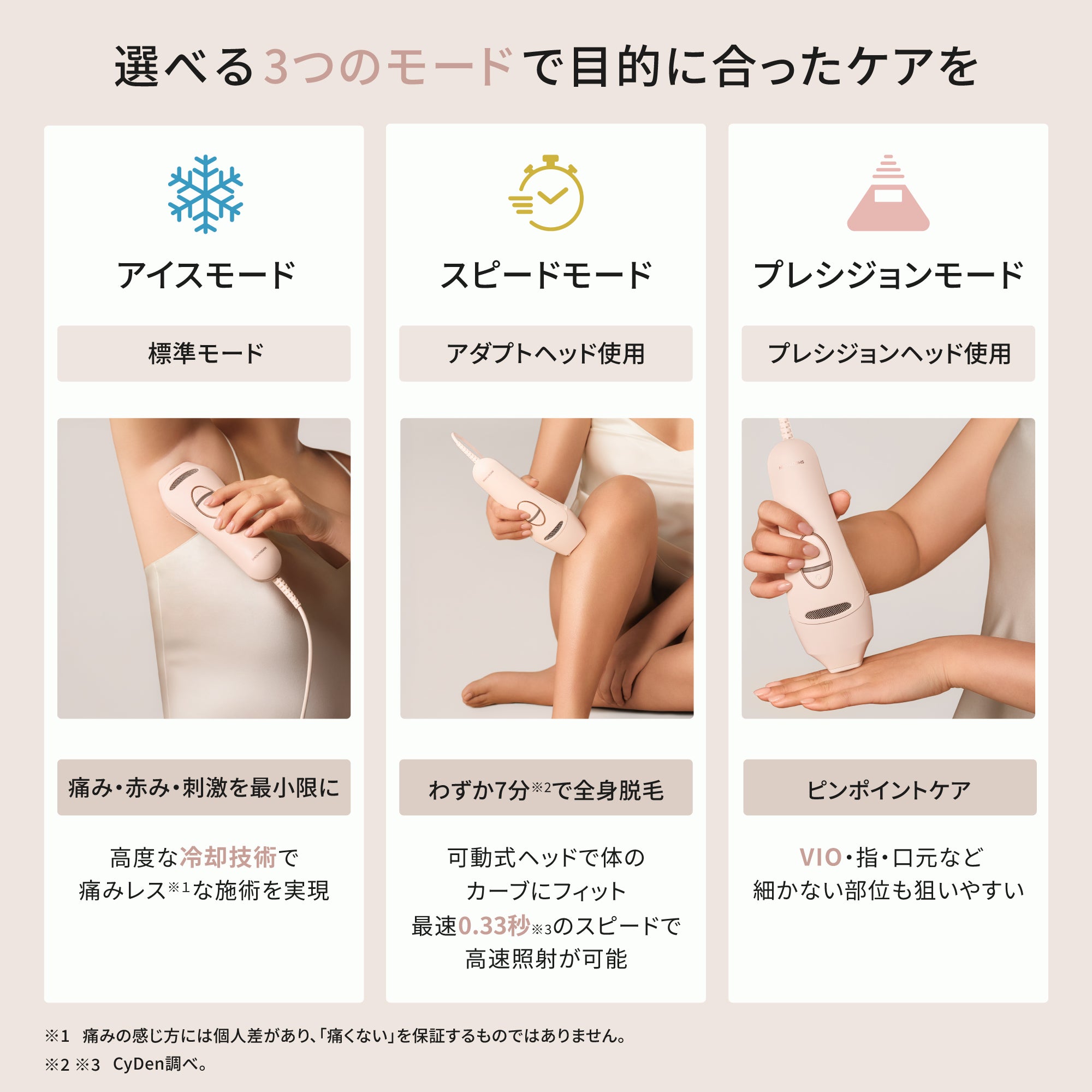- 選べる3つのモードでシリーズ最高峰の冷却×スピード×VIO。独自の冷却機能で心地よく、速く正確なサロン級*²のおうちケアを。